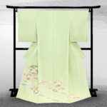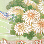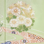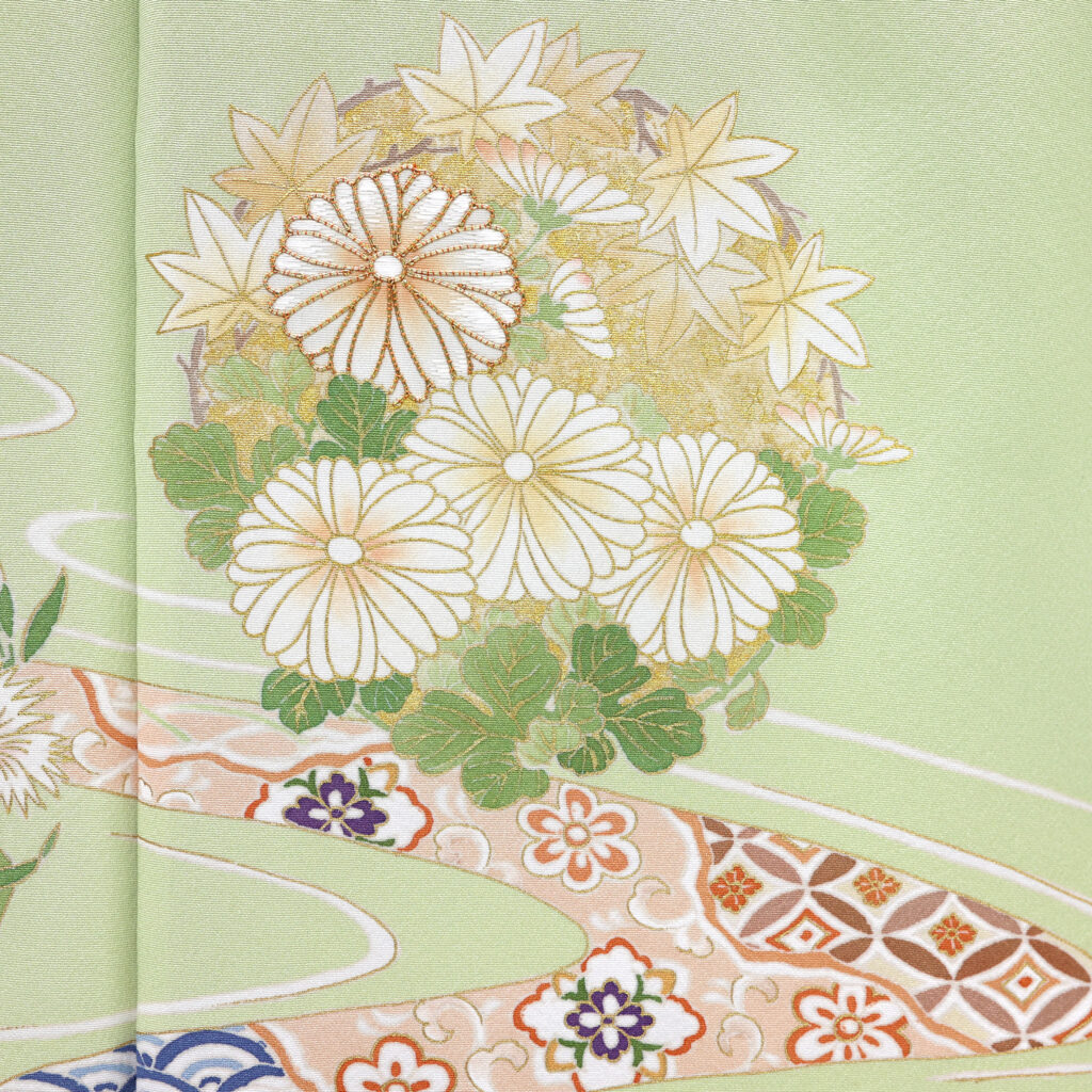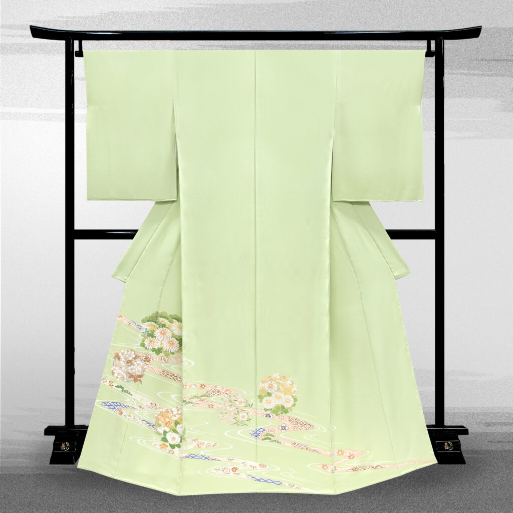 吉祥紋様の草花を花の丸で表現した色留袖です。 まわりにあしらわれた流水のなかにも草花や幾何学文様が散りばめられ、さらに華やかさを引き立てます。 明るい鶸色の地色はまわりに彩りを添えるお色味です。 五つ紋を入れて叙勲や、結婚式の披露宴などにもお召しいただけます。